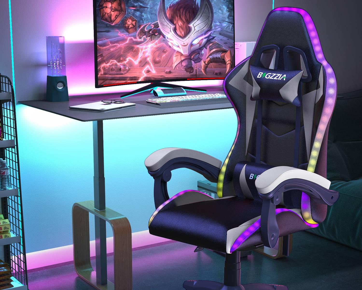 Silla Ergonómica para Juegos con Luces LED RGB, Reclinable, Reposacabezas y Soporte Lumbar Estilo Carrera